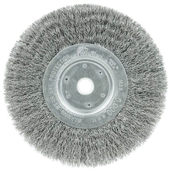 Weiler 6" Narrow Face Crimped Wire Wheel Brush provides a flexible brushing action and consistent performance for demanding light duty cleaning and deburring applications. Featuring Weiler's solid ring construction, these radial brushes are available in heat-treated steel, type 302 stainless steel and brass wire for use in a wide variety of applications. 5/8"-1/2" arbor hole for use on bench/pedestal grinder, CNC/milling/automatic machines and straight grinders. Intended for use on straight grinders and stationary machines such as bench or pedestal grinders and buffing lathes. Featuring Weiler's solid ring construction, these radial brushes are available in heat treated steel, type 302 stainless steel and brass wire for use in a wide variety of applications. Provides a flexible brushing action and consistent performance for demanding light duty cleaning and deburring applications. 7/16 in T at face plate. .