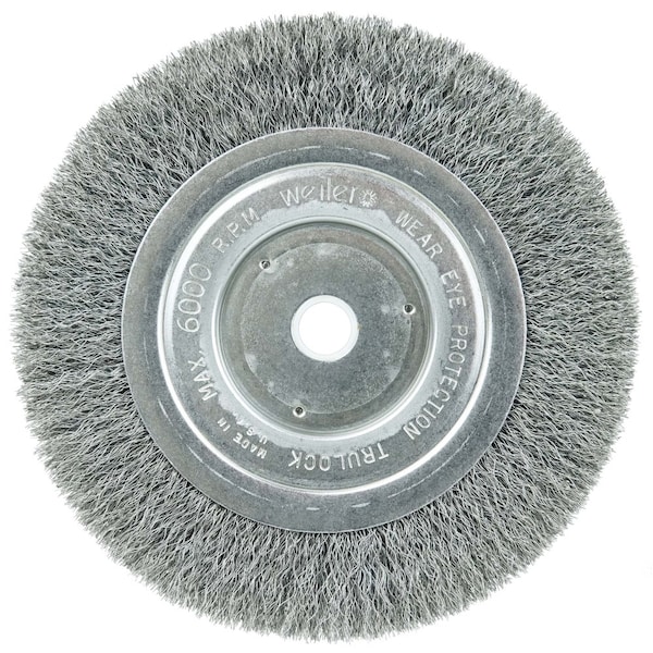 Weiler 6" Narrow Face Crimped Wire Wheel Brush provides a flexible brushing action and consistent performance for demanding light duty cleaning and deburring applications. Featuring Weiler's solid ring construction, these radial brushes are available in heat-treated steel, type 302 stainless steel and brass wire for use in a wide variety of applications. 5/8"-1/2" arbor hole for use on bench/pedestal grinder, CNC/milling/automatic machines and straight grinders. Feature a shorter trim length, narrower face width and the same durable construction as other Weiler crimped wire wheels. Designed specifically for use on small bench grinders for reduced flaring and long life in a broad range of applications. Durable construction. 7/16 in T of face plate. .