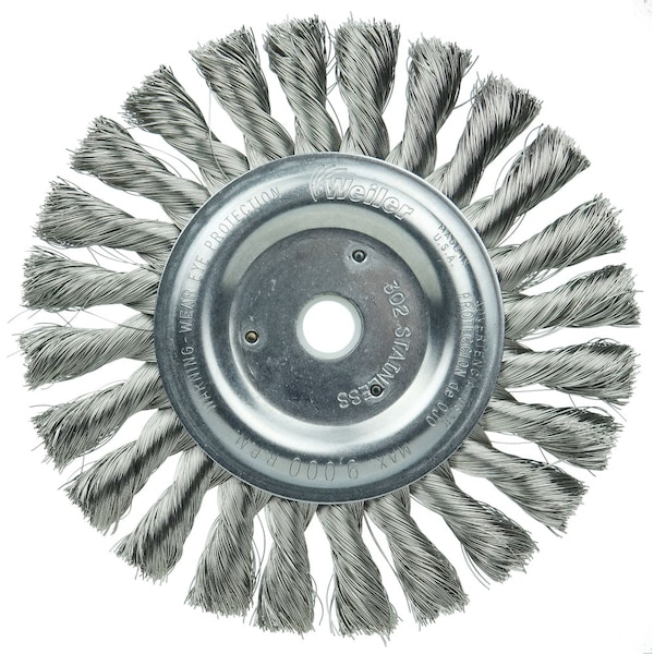 Weiler 6" Standard Twist Knot Wire Wheel Brush provides a heavy-duty brushing action with some flexibility for demanding deburring cleaning and surface preparation applications on somewhat irregular surfaces. Featuring Weiler's individual knot hole construction, these radial brushes are available in heat-treated steel, type 302 stainless steel and bronze wire for use in a wide variety of applications. 5/8"-1/2" arbor hole for use on bench/pedestal grinder, die grinder, right angle die grinder and straight grinders. Provide heavy duty brushing action with some flexibility. Ideal for demanding cleaning applications on somewhat irregular surfaces. Knot wire wheels with an arbor hole are intended for use on straight grinders and stationary machines such as bench or pedestal grinders and buffing lathes. Featuring Weiler's individual knot hole construction, these radial brushes are available in heat-treated steel, type 302 stainless steel and bronze wire for use in a wide variety of applications. .