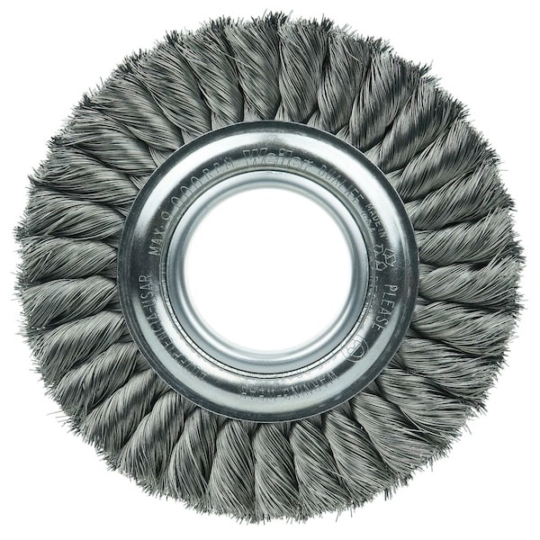 Weiler 6" Standard Twist Knot Wire Wheel Brush provides a heavy-duty brushing action with some flexibility for demanding deburring cleaning and surface preparation applications on somewhat irregular surfaces. Featuring Weiler's individual knot hole construction, these radial brushes are available in heat-treated steel, type 302 stainless steel and bronze wire for use in a wide variety of applications. 2" arbor hole for use on bench/pedestal grinder, die grinder, right angle die grinder and straight grinders. Provide heavy duty brushing action with some flexibility. Double row of knotted wire for a wider brush face. Knot wire wheels with an arbor hole are intended for use on straight grinders and stationary machines such as bench or pedestal grinders and buffing lathes. Featuring Weiler's individual knot hole construction, these radial brushes are available in heat-treated steel, type 302 stainless steel and bronze wire for use in a wide variety of applications. Ideal for demanding cleaning applications on somewhat irregular surfaces.