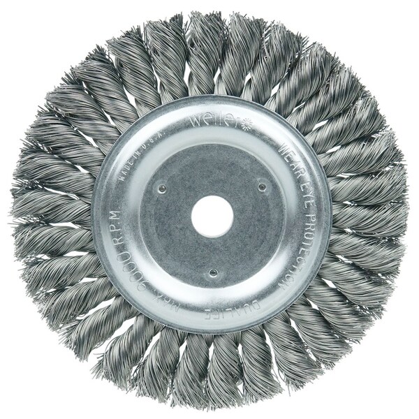Weiler 6" Standard Twist Knot Wire Wheel Brush provides a heavy-duty brushing action with some flexibility for demanding deburring cleaning and surface preparation applications on somewhat irregular surfaces. Featuring Weiler's individual knot hole construction, these radial brushes are available in heat-treated steel, type 302 stainless steel and bronze wire for use in a wide variety of applications. 5/8"-1/2" arbor hole for use on bench/pedestal grinder, die grinder, right angle die grinder and straight grinders. Provide heavy duty brushing action with some flexibility. Ideal for demanding cleaning applications on somewhat irregular surfaces. Knot wire wheels with an arbor hole are intended for use on straight grinders and stationary machines such as bench or pedestal grinders and buffing lathes. Featuring Weiler's individual knot hole construction, these radial brushes are available in heat-treated steel, type 302 stainless steel and bronze wire for use in a wide variety of applications. .