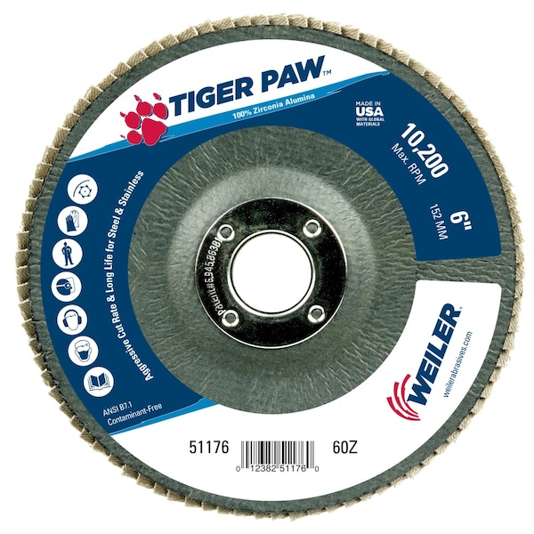 Tiger Paw 6 inch conical flap discs are designed for demanding metalworking applications like edge grinding on steel and stainless steel. Tiger Paw leverages 100% zirconia alumina grain that holds up under high temperatures and extreme pressure delivering high performance on heavy duty applications.