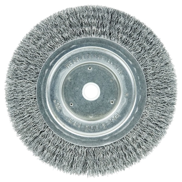 Wolverine 6" Medium Face Bench Grinder Wheel Brush provides a flexible brushing action and cost-effective performance in general purpose cleaning and deburring applications. Wide face width covers more area. 5/8"-1/2" arbor hole for use on bench/pedestal and straight grinders. Provide a flexible brushing action and cost-effective performance in general purpose cleaning and deburring applications. feature a wider face width to cover more area. For use on straight grinders and stationary machines such as bench or pedestal grinders and buffing lathes. 1/2 in T of face plate. .