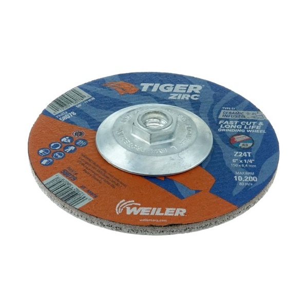 Tiger Zirc 6 inch type 27 grinding wheels cut faster and last longer so you get proven productivity at an exceptional total cost. The self-sharpening zirconia alumina grains retain a high cut rate throughout the life of the wheel while a hard bond delivers long wheel life for heavy duty applications. The flat profile with depressed center allows for a wide range of grinding angles (0-45°). 1/4" wheel thickness is ideal for heavy stock removal, scale removal, weld removal, weld blending, edge beveling and torch-cut softening with a right angle grinder. The 5/8" - 11 nutted metal hub allows for quick spin-on, spin-off changeover and eliminates cross-threading or sticking to spindle due to heat build-up.