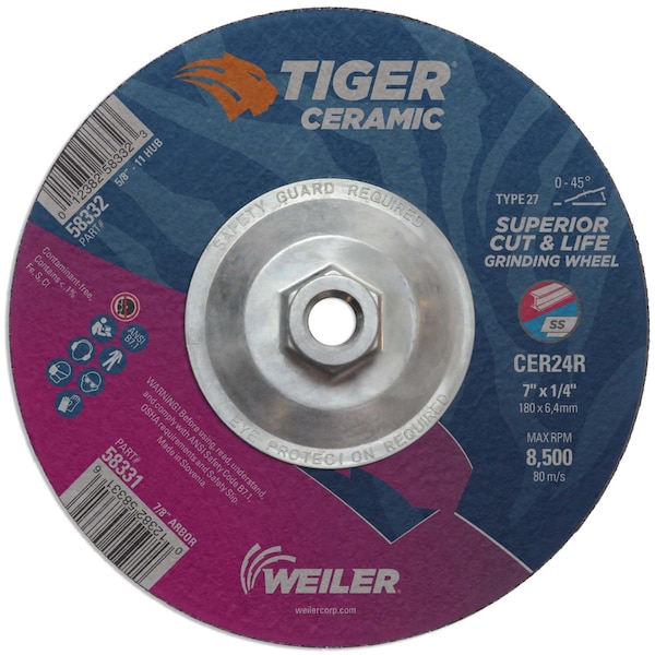 With Tiger Ceramic 7 inch type 27 depressed center grinding wheels, there’s no more compromise when grinding the toughest metals. Now you can maximize your time on the job with a superior combination of life and cut rate for maximum productivity. Self-sharpening and cool cutting, ceramic grains remove material effortlessly while a hard bond keeps working longer. The flat profile of the wheel in combination with depressed center allows for a wide range of grinding angles (0-45).