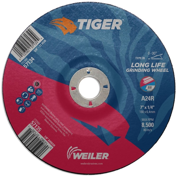 Weiler Tiger aluminum oxide 7 inch type 28 depressed center grinding wheels deliver the right combination of performance and value when grinding steel and other metals. This depressed center wheel with a concave "or saucer" shape is designed for increased aggression at lower working angles and increased access. The 1/4" wheel thickness is ideal for heavy stock removal, scale removal, weld removal, weld blending, edge beveling and torch-cut softening with a right angle grinder. The 7/8" open arbor offers a cost-effective mounting option when using adapting nuts.