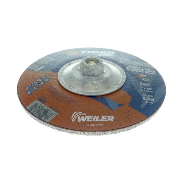 Tiger Zirc 7 inch type 28 grinding wheels cut faster and last longer so you get proven productivity at an exceptional total cost. The self-sharpening zirconia alumina grains retain a high cut rate throughout the life of the wheel while a hard bond delivers long wheel life for heavy duty applications. This depressed center wheel with a concave "or saucer" shape is designed for increased aggression at lower working angles and increased access. 1/4" wheel thickness is ideal for heavy stock removal, scale removal, weld removal, weld blending, edge beveling and torch-cut softening with a right angle grinder. The 5/8" - 11 nutted metal hub allows for quick spin-on, spin-off changeover and eliminates cross-threading or sticking to spindle due to heat build-up.
