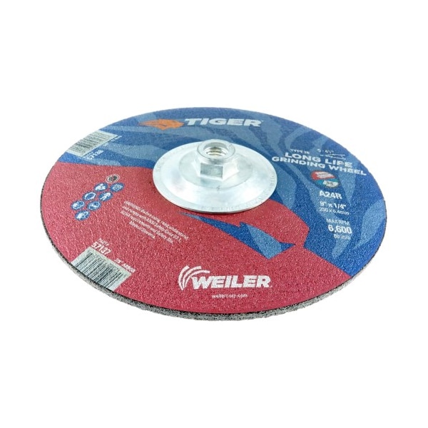 Weiler Tiger aluminum oxide 9 inch type 28 depressed center grinding wheels deliver the right combination of performance and value when grinding steel and other metals. This depressed center wheel with a concave "or saucer" shape is designed for increased aggression at lower working angles and increased access. The 1/4" wheel thickness is ideal for heavy stock removal, scale removal, weld removal, weld blending, edge beveling and torch-cut softening with a right angle grinder. The 5/8" - 11 nutted metal hub allows for quick spin-on, spin-off changeover and eliminates cross-threading or sticking to spindle due to heat build-up.