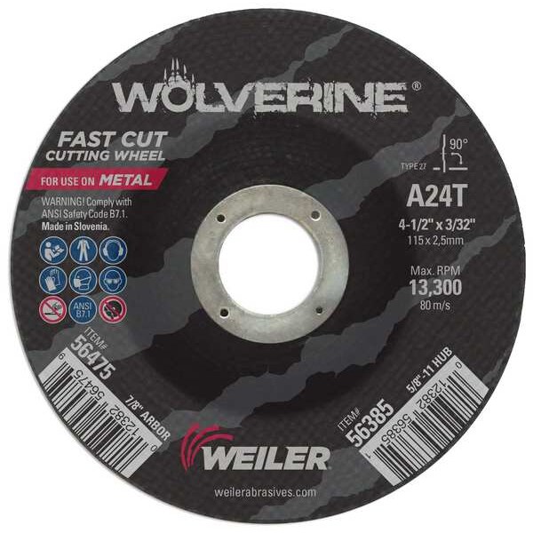 Abrasive Cut-Off Wheel, Type 27, 4-1/2 in Dia, 3/32 in Thick, Aluminum Oxide, 24 Grit