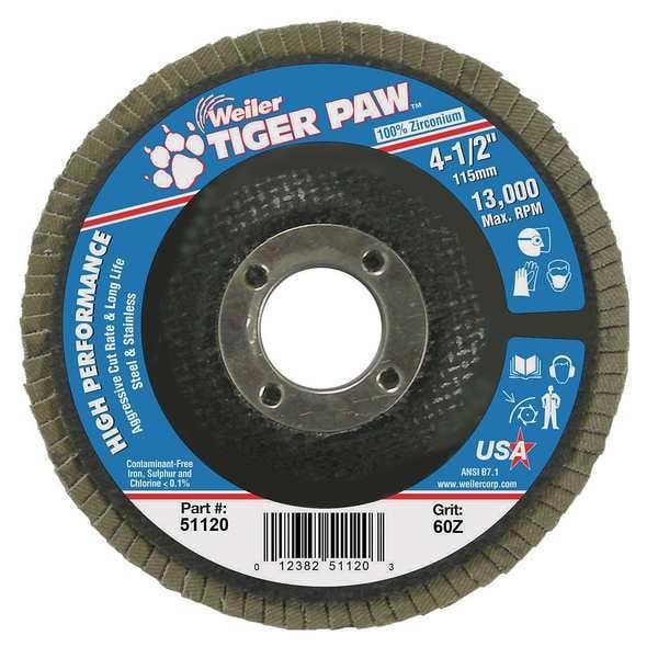 Flap Disc, Abrasive Type Coated, Abrasive Material Zirconia Alumina, Grade Medium, Backing Plate Material Phenolic, Connector Size 7/8 in, Connector Type Unthreaded Hole, Density Rating Standard, Flap Disc Type Type 29, Overall Diameter 4 1/2 in, Quick Change System Not Applicable, Series Tiger Paw, Backing Material Phenolic, Backing Weight X, Grit 60, Maximum Operating Speed 13,000 RPM