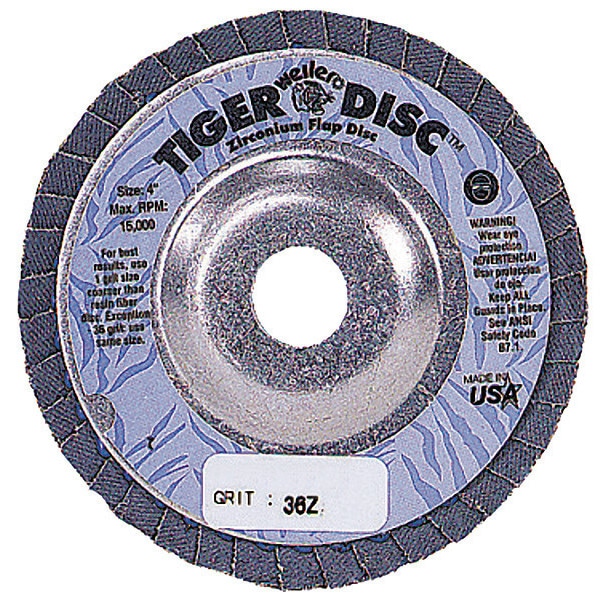 Flap Disc, Abrasive Type Coated, Abrasive Material Zirconia Alumina, Grade Medium, Backing Plate Material Aluminum, Connector Size 7/8 in, Connector Type Unthreaded Hole, Density Rating Standard, Flap Disc Type Type 29, Overall Diameter 4 1/2 in, Quick Change System Not Applicable, Series Tiger Aluminum Back, Backing Material Aluminum, Grit 60, Maximum Operating Speed 13,000 RPM