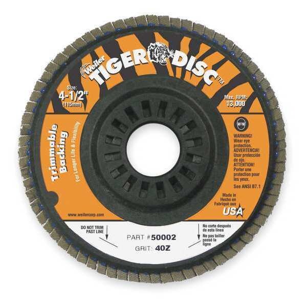 Flap Disc, Abrasive Type Coated, Abrasive Material Zirconia Alumina, Grade Medium, Backing Plate Material Composite, Connector Size 5/8 In.-11, Connector Type Threaded Hole, Density Rating Standard, Flap Disc Type Type 29, Overall Diameter 5 in, Series Tiger Trim, Backing Material Composite, Backing Weight Y, Grit 80, Maximum Operating Speed 12,000 RPM, Features Trimmable