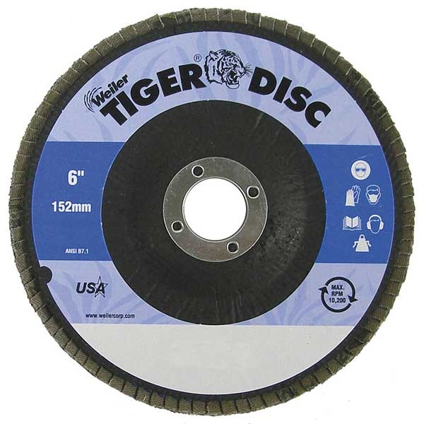 Flap Disc, Abrasive Type Coated, Abrasive Material Zirconia Alumina, Grade Coarse, Backing Plate Material Phenolic, Connector Size 7/8 in, Connector Type Unthreaded Hole, Density Rating Standard, Flap Disc Type Type 29, Overall Diameter 6 in, Quick Change System Not Applicable, Series Tiger, Backing Material Phenolic, Backing Weight X, Grit 40, Maximum Operating Speed 10,200 RPM