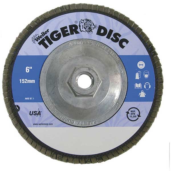 Flap Disc, Abrasive Type Coated, Abrasive Material Zirconia Alumina, Grade Coarse, Backing Plate Material Phenolic, Connector Size 5/8 In.-11, Connector Type Threaded Hole, Density Rating Standard, Flap Disc Type Type 29, Overall Diameter 6 in, Quick Change System Not Applicable, Series Tiger, Backing Material Phenolic, Backing Weight X, Grit 40, Maximum Operating Speed 10,200 RPM