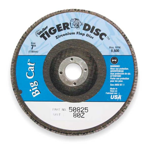 Flap Disc, Abrasive Type Coated, Abrasive Material Zirconia Alumina, Grade Medium, Backing Plate Material Phenolic, Connector Size 7/8 in, Connector Type Unthreaded Hole, Density Rating High, Flap Disc Type Type 27, Overall Diameter 7 in, Series Tiger Big Cat HD, Backing Material Phenolic, Backing Weight X, Grit 80, Maximum Operating Speed 8,600 RPM