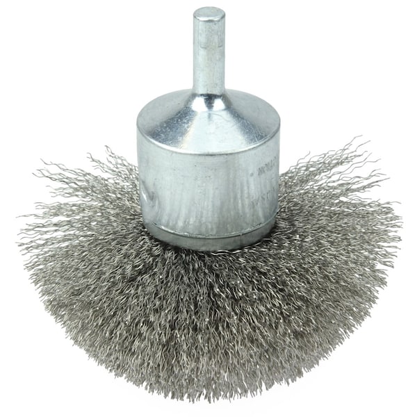 Weiler 3" Circular Flared Crimped Wire End Brush features wire fill which has been "pre-flared" to match the working angle of the brush at operating speed and suited for addressing broad and slightly contoured surfaces on stainless steel parts. 1/4" stem diameter for use on die grinder, drill, drill press and right angle air die grinder. Solid end construction with flexible brushing action. Crimped "Pre-Flared" wire fill to match the working angle of the brush at operating speed. Suited for addressing broad and slightly contoured surfaces. . .