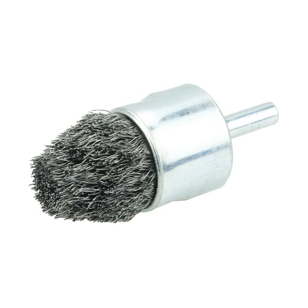 Weiler 1" Controlled Flare Crimped Wire End Brush is a uniquely trimmed crimped wire fill for more effective brushing action and greatly enhanced durability when cleaning corners and filet welds. 1/4" stem diameter for use on die grinder and right angle die grinders. Uniquely trimmed crimped wire fill for more effective brushing action. Greatly enhanced durability when cleaning corners and filet welds. Controlled flare. . .