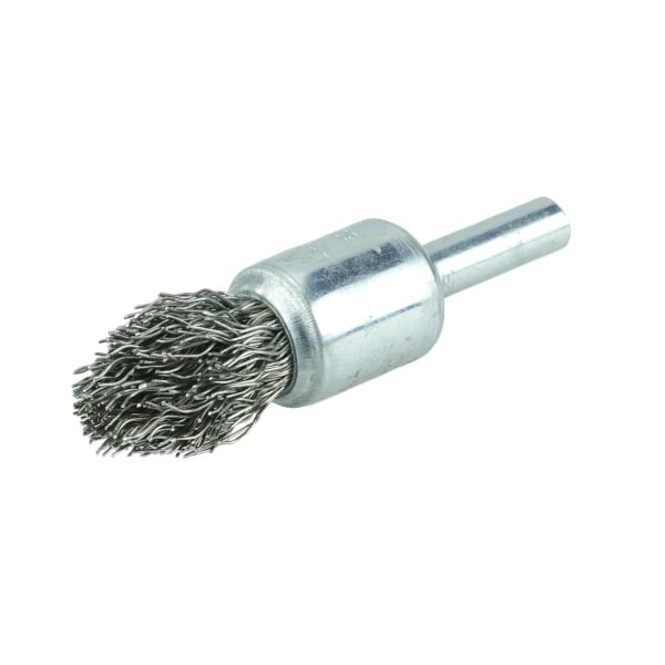 Weiler 1/2" Controlled Flare Crimped Wire End Brush is a uniquely trimmed crimped wire fill for more effective brushing action and greatly enhanced durability when cleaning corners and filet welds. 1/4" stem diameter for use on die grinder and right angle die grinders. Uniquely trimmed crimped wire fill for more effective brushing action. Greatly enhanced durability when cleaning corners and filet welds. 2000 rpm maximum speed. . .