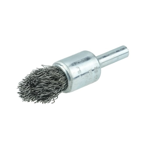 Weiler 1/2" Controlled Flare Crimped Wire End Brush is a uniquely trimmed crimped wire fill for more effective brushing action and greatly enhanced durability when cleaning corners and filet welds. 1/4" stem diameter for use on die grinder and right angle die grinders. Uniquely trimmed crimped wire fill for more effective brushing action. Greatly enhanced durability when cleaning corners and filet welds. For use with die grinder and right angle air die grinder power tools. . .