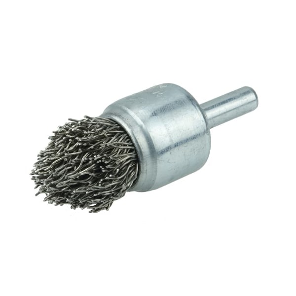 Weiler 1/4" Controlled Flare Crimped Wire End Brush is a uniquely trimmed crimped wire fill for more effective brushing action and greatly enhanced durability when cleaning corners and filet welds. 1/4" stem diameter for use on die grinder and right angle die grinders. Uniquely trimmed crimped wire fill for more effective brushing action. Greatly enhanced durability when cleaning corners and filet welds. 2000 rpm maximum speed. . .