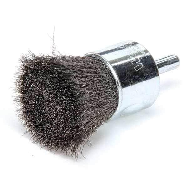 End Brush, Product Type End Brush, Quick Change System Not Applicable, Bristle Type Crimped Wire, Bristle Material Carbon Steel, Brush Dia. 1 in, Wire Dia. 0.006 in, Bristle Length 1 in, Grit Not Applicable, Overall Length 3 in, Compatible Tool Type Die Grinder, Drill, Impact Driver, Pencil Grinder, Straight Grinder, Color Silver, Primary Material Application Carbon Steel, Cast Iron, Connector Type Round Shank, Connector Size 1/4 in, Operating Speed - Maximum 22,000 RPM, Shank Length 5/8 in