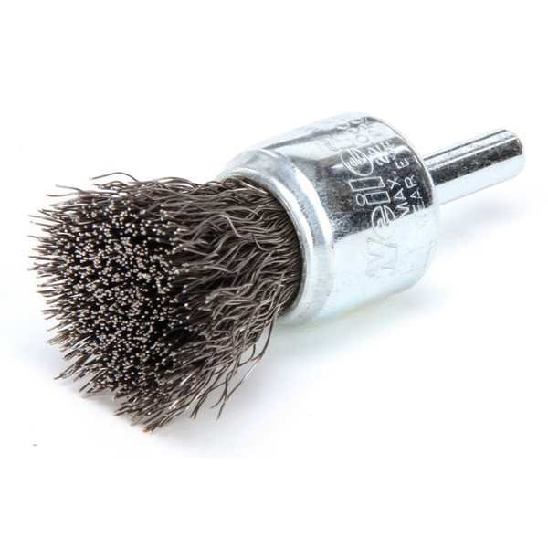 End Brush, Product Type End Brush, Quick Change System Not Applicable, Bristle Type Crimped Wire, Bristle Material Carbon Steel, Brush Dia. 3/4 in, Wire Dia. 0.01 in, Bristle Length 3/8 in, Grit Not Applicable, Overall Length 2 1/4 in, Compatible Tool Type Die Grinder, Drill, Impact Driver, Pencil Grinder, Straight Grinder, Color Silver, Primary Material Application Carbon Steel, Cast Iron, Connector Type Round Shank, Connector Size 1/4 in, Operating Speed - Maximum 22,000 RPM