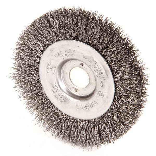 Wire Wheel Brush, Bristle Type Crimped Wire, Product Type Wire Wheel Brush, Bristle Material Carbon Steel, Brush Dia. 4 in, Grit Not Applicable, Face Width 1/2 in, Bristle Diameter 0.014 in, Bristle Length 7/8 in, Compatible Tool Type Die Grinder, Drill Press, Pencil Grinder, Straight Grinder, Primary Material Application Carbon Steel, Connector Type Threaded Hole, Connector Size 5/8 in, Operating Speed - Maximum 20,000 RPM, Color Not Applicable