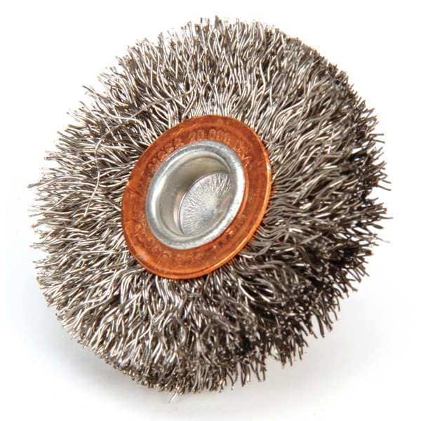 Wire Wheel Brush, Bristle Type Crimped Wire, Product Type Wire Wheel Brush, Bristle Material Stainless Steel, Brush Dia. 2 in, Grit Not Applicable, Face Width 3/8 in, Bristle Diameter 0.012 in, Bristle Length 1/2 in, Compatible Tool Type Die Grinder, Drill Press, Pencil Grinder, Straight Grinder, Primary Material Application Stainless Steel, Connector Type Round Shank, Connector Size 1/4 in, Operating Speed - Maximum 20,000 RPM, Shank Length 1/4 in, Color Not Applicable
