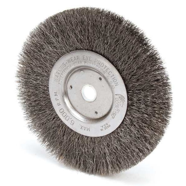 Wire Wheel Brush, Bristle Type Crimped Wire, Product Type Wire Wheel Brush, Bristle Material Carbon Steel, Brush Dia. 6 in, Grit Not Applicable, Face Width 3/4 in, Bristle Diameter 0.008 in, Bristle Length 1 7/16 in, Compatible Tool Type Bench Grinder, Primary Material Application Carbon Steel, Connector Type Threaded Hole, Connector Size 5/8 in to 1/2 in, Operating Speed - Maximum 12,500 RPM, Shank Length Not Applicable, Color Not Applicable