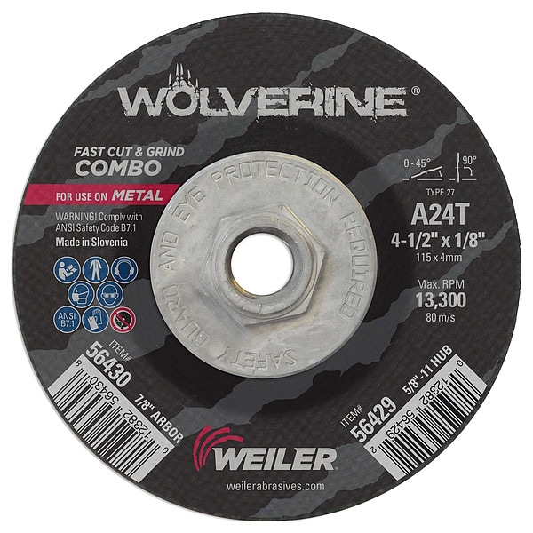 Cutting Wheel, Type 27, 4 1/2 in Dia, 0.125 in Thick, 5/8 in-11 UNC Nut Arbor Hole Size, 24 Grit