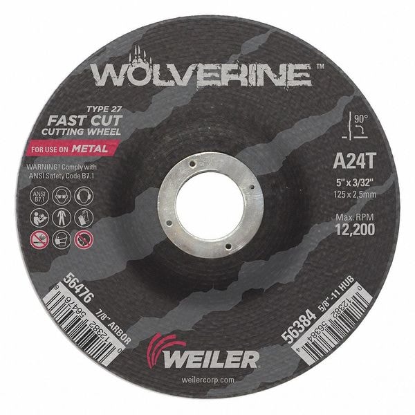 Cutting Wheel, Type 27, 5 in Dia, 0.0938 in Thick, 7/8 in Arbor Hole Size, Aluminum Oxide