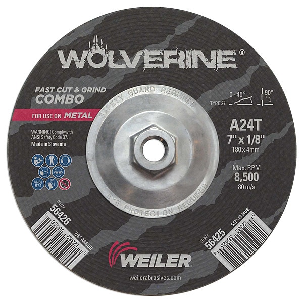 Cutting Wheel, Type 27, 7 in Dia, 0.125 in Thick, 5/8 in-11 UNC Nut Arbor Hole Size, Aluminum Oxide