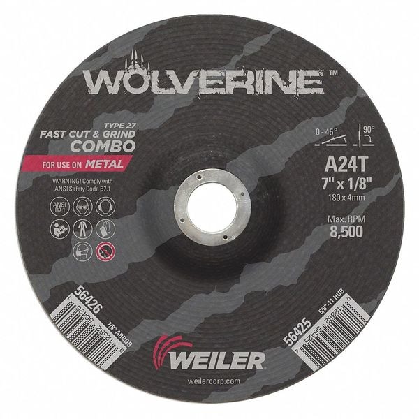 Cutting Wheel, Type 27, 7 in Dia, 0.125 in Thick, 7/8 in Arbor Hole Size, Aluminum Oxide