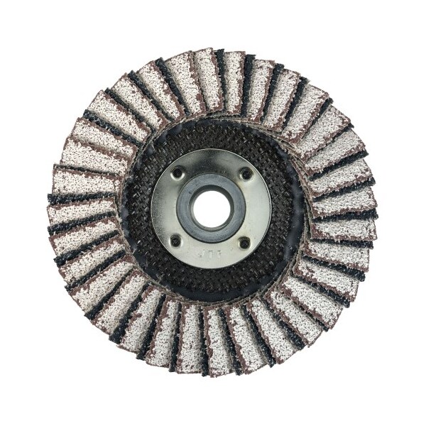Flap Disc, Abrasive Type Coated, Abrasive Material Zirconia Alumina, Grade Coarse, Backing Plate Material Phenolic, Connector Size 5/8 In.-11, Connector Type Threaded Hole, Density Rating Standard, Flap Disc Type Type 29, Overall Diameter 4 1/2 in, Quick Change System Not Applicable, Series Tiger Aluminum, Backing Material Phenolic, Grit 36, Maximum Operating Speed 13,000 RPM, Color Blue, White, Features Performance Coated