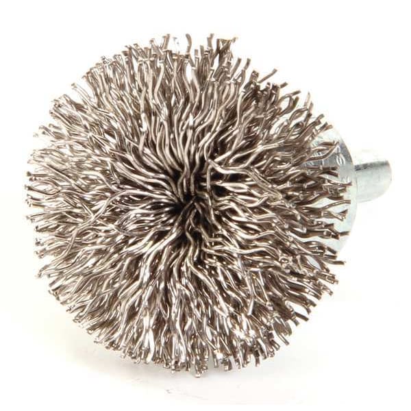 Flared End Brush, Product Type Flared End Brush, Quick Change System Not Applicable, Bristle Type Crimped Wire, Bristle Material Stainless Steel, Brush Dia. 1 1/2 in, Wire Dia. 0.02 in, Bristle Length 7/8 in, Grit Not Applicable, Overall Length 3 in, Compatible Tool Type Straight Grinder, Drill, Impact Driver, Pencil Grinder, Color Silver, Primary Material Application Stainless Steel, Connector Type Round Shank, Connector Size 1/4 in, Operating Speed - Maximum 20,000 RPM, Shank Length 5/8 in