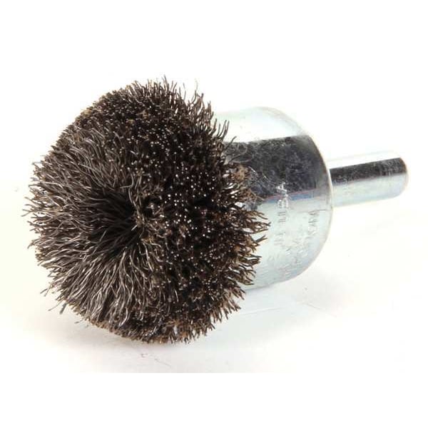 Flared End Brush, Product Type Flared End Brush, Quick Change System Not Applicable, Bristle Type Crimped Wire, Bristle Material Carbon Steel, Brush Dia. 1 1/4 in, Wire Dia. 0.08 in, Bristle Length 1/4 in, Grit Not Applicable, Overall Length 2 1/8 in, Compatible Tool Type Straight Grinder, Drill, Impact Driver, Pencil Grinder, Color Silver, Primary Material Application Carbon Steel, Connector Type Round Shank, Connector Size 1/4 in, Operating Speed - Maximum 20,000 RPM, Shank Length 5/8 in