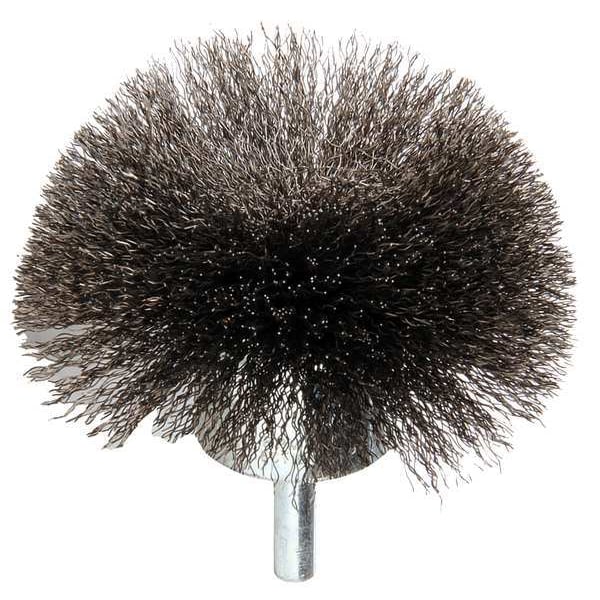 Flared End Brush, Product Type Flared End Brush, Quick Change System Not Applicable, Bristle Type Crimped Wire, Bristle Material Carbon Steel, Brush Dia. 3 in, Wire Dia. 0.008 in, Bristle Length 7/8 in, Grit Not Applicable, Overall Length 3 in, Compatible Tool Type Die Grinder, Drill, Impact Driver, Pencil Grinder, Straight Grinder, Color Silver, Primary Material Application Carbon Steel, Cast Iron, Connector Type Round Shank, Connector Size 1/4 in, Operating Speed - Maximum 16,000 RPM