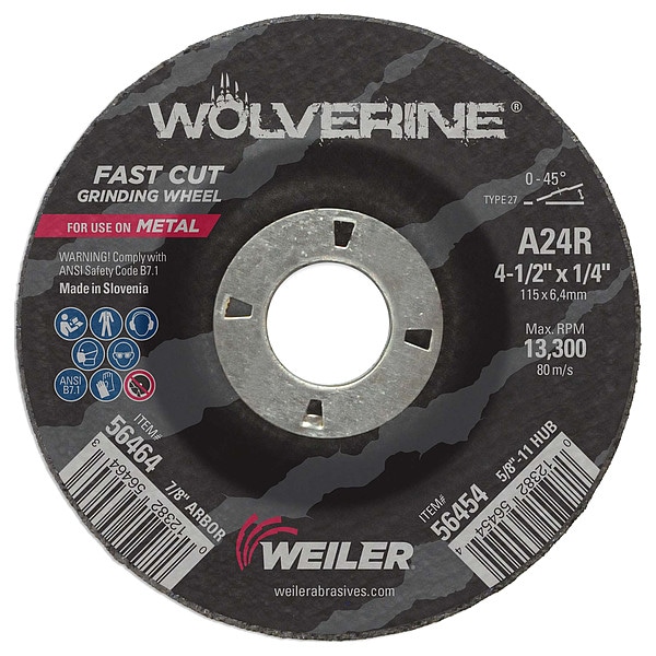 Grinding Wheel, Type 27, 4 1/2 in Dia, 0.25 in Thick, 7/8 in Arbor Hole Size, Aluminum Oxide