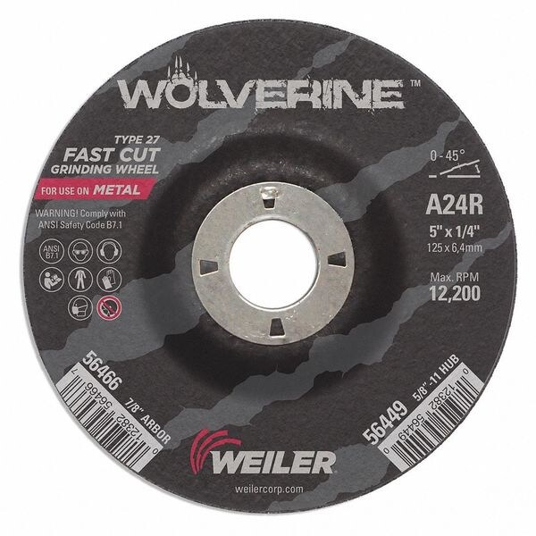 Grinding Wheel, Type 27, 5 in Dia, 1/4 in Thick, 7/8 in Arbor Hole Size, Aluminum Oxide