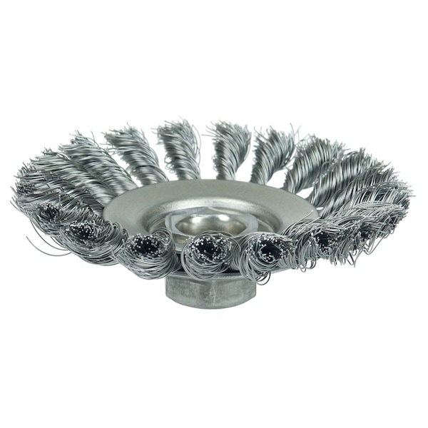 Weiler 4-1/2" Knot Wire Bevel Brush provides heavy-duty brushing action with some flexibility for demanding cleaning applications on somewhat irregular surfaces. Ideal for cleaning filet welds and into corners. 5/8"-11 nut for use on right angle grinders. Saucer-shaped radial wheels which provide a heavy-duty brushing action with some flexibility. Ideal for cleaning filet welds and into corners. . . .