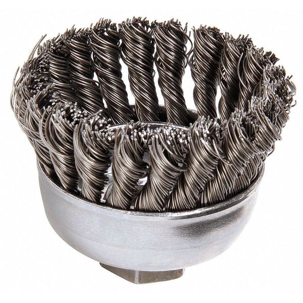 Cup Brush, Product Type Cup Brush, Quick Change System Not Applicable, Bristle Type Standard Twist Knot Wire, Bristle Material Carbon Steel, Brush Dia. 2-3/4 in, Wire Dia. 0.02 in, Bristle Length 1 in, Grit Not Applicable, Overall Length 2 11/16 in, Compatible Tool Type Right-Angle Grinder, Color Silver, Primary Material Application Carbon Steel, Connector Type Threaded Hole, Connector Size 5/8 In.-11, Operating Speed - Maximum 14,000 RPM, Shank Length Not Applicable