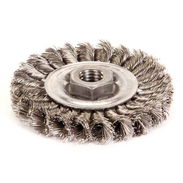 Wire Wheel Brush, Bristle Type Standard Twist Knot Wire, Product Type Wire Wheel Brush, Bristle Material Stainless Steel, Brush Dia. 4 in, Grit Not Applicable, Face Width 1/2 in, Bristle Diameter 0.014 in, Bristle Length 7/8 in, Compatible Tool Type Angle Grinder, Primary Material Application Carbon Steel, Connector Type Threaded Hole, Connector Size 5/8 In.-11, Operating Speed - Maximum 6,000 RPM, Shank Length Not Applicable, Color Not Applicable