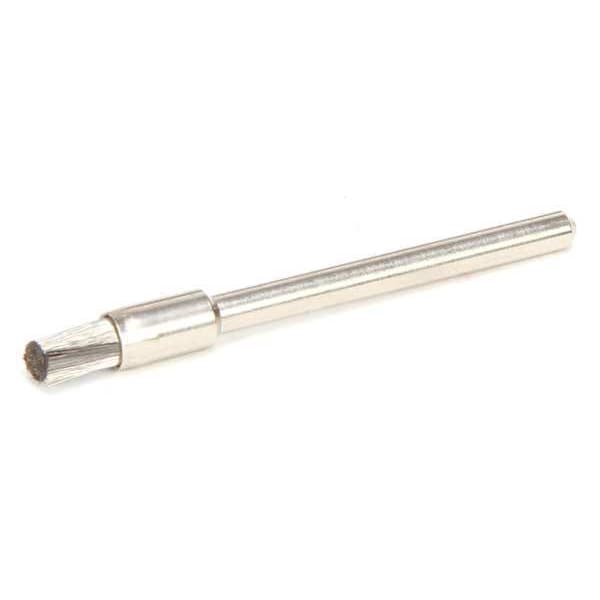 Miniature End Brush, Product Type End Brush, Quick Change System Not Applicable, Bristle Type Crimped Wire, Bristle Material Stainless Steel, Brush Dia. 3/16 in, Wire Dia. 0.003 in, Bristle Length 1/4 in, Grit Not Applicable, Overall Length 2 1/4 in, Compatible Tool Type Die Grinder, Drill, Impact Driver, Pencil Grinder, Straight Grinder, Color Silver, Primary Material Application Stainless Steel, Connector Type Round Shank, Connector Size 1/8 in, Operating Speed - Maximum 37,000 RPM