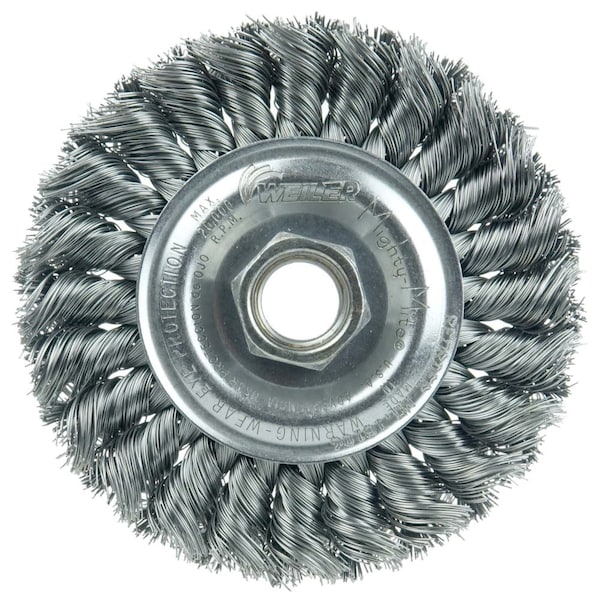 Weiler 4" Standard Twist Knot Wire Wheel Brush provides a heavy-duty brushing action with some flexibility for demanding deburring cleaning and surface preparation applications on somewhat irregular surfaces. 5/8"-11 nut for use on right angle grinders. Provide heavy-duty brushing action with some flexibility. Ideal for demanding cleaning applications on somewhat irregular surfaces. . . .