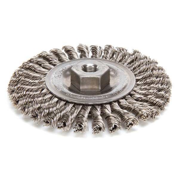 Wire Wheel Brush, Bristle Type Stringer Bead Twist Knot Wire, Product Type Wire Wheel Brush, Bristle Material Stainless Steel, Brush Dia. 4 in, Grit Not Applicable, Face Width 3/16 in, Bristle Diameter 0.02 in, Bristle Length 7/8 in, Compatible Tool Type Angle Grinder, Primary Material Application Carbon Steel, Connector Type Threaded Hole, Connector Size 3/8 In.-24, Operating Speed - Maximum 20,000 RPM, Shank Length Not Applicable, Color Not Applicable