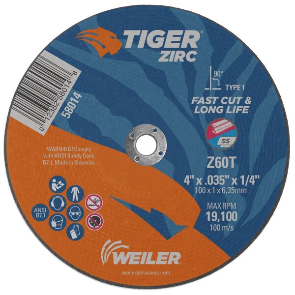 Tiger Zirc 4 inch type 1 cutting wheels cut faster and last longer so you get proven productivity at an exceptional total cost. The self-sharpening zirconia alumina grains retain a high cut rate throughout the life of the wheel while a hard bond delivers long wheel life for heavy duty applications. The flat type 1 profile allows for deep cuts commonly required when cutting metal. The .035" wheel thickness is ideal for cutting tubes, bar stock, and large cross-sections with a grinder. The 1/4" open arbor offers a cost-effective mounting option when using adapting nuts.