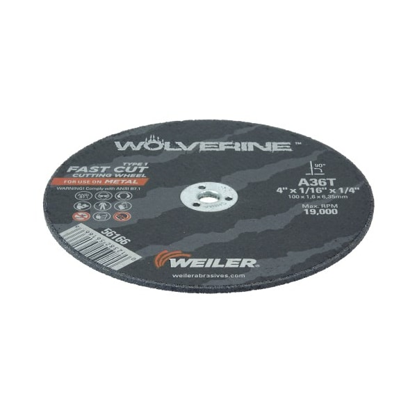 Weiler Wolverine 4 inch type 1 cutting wheels deliver a fast cut rate and consistent performance at a good value when cutting steel and other metals. The flat profile allows for deep cuts and 1/16" thickness is ideal for cutting tubes, bar stock and large cross-sections with a die grinder. The 1/4" open arbor offers a cost-effective mounting option when using adapting nuts.