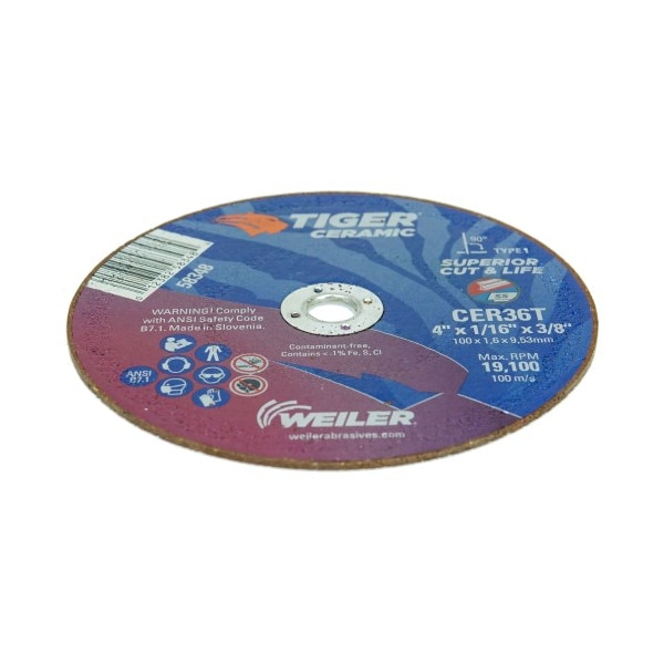With Tiger Ceramic 4 inch type 1 cutting wheels, there’s no more compromise when cutting the toughest metals. Now you can maximize your time on the job with a superior combination of life and cut rate for maximum productivity. Self-sharpening and cool cutting, ceramic grains remove material effortlessly while a hard bond keeps working longer. The flat profile and .035 wheel thickness allows for deep cuts on tubes, bar stock, and large cross sections.