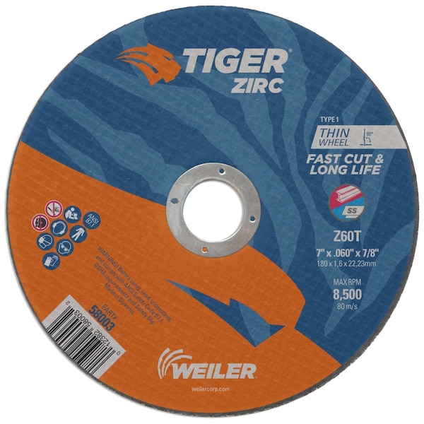 Tiger Zirc 7 inch type 1 cutting wheels cut faster and last longer so you get proven productivity at an exceptional total cost. The self-sharpening zirconia alumina grains retain a high cut rate throughout the life of the wheel while a hard bond delivers long wheel life for heavy duty applications. The flat type 1 profile allows for deep cuts commonly required when cutting metal. The .060" wheel thickness is ideal for cutting tubes, bar stock, and large cross-sections with a right angle grinder. The 7/8" open arbor offers a cost-effective mounting option when using adapting nuts.