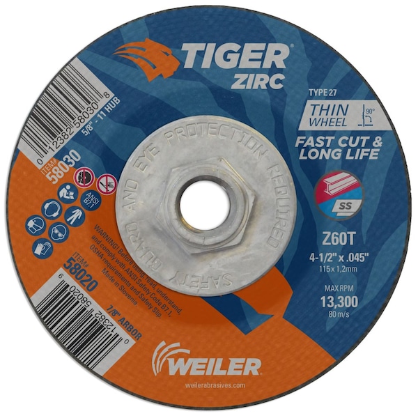 Tiger Zirc 4.5 inch type 27 depressed center cutting wheels cut faster and last longer so you get proven productivity at an exceptional total cost. The self-sharpening zirconia alumina grains retain a high cut rate throughout the life of the wheel while a hard bond delivers long wheel life for heavy duty applications. The flat profile of the wheel in combination with depressed center allows for a wide range of grinding angles (0-45). The .045" wheel thickness is ideal for cutting tubes, bar stock, and large cross-sections with a right angle grinder. The small 5/8" - 11 nutted metal hub reduces gouging of the workpiece and allows for 30% more usable surface area of the wheel in addition to providing quick spin-on, spin-off changeover of a standard hub.